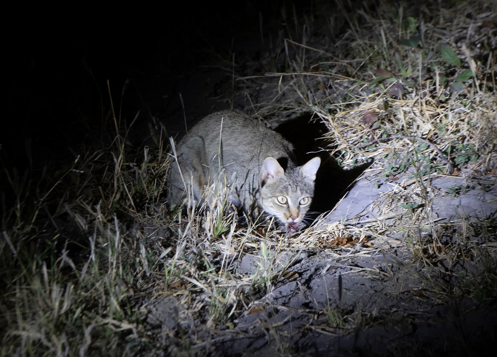 Night drives – with the tracker shining a spotlight around the 180 degrees in front of the vehicle – can be quite interesting. It is not unusual for an elephant to be right in the vehicle’s path, which results in a huge roar which startles everyone. There are creatures who are usually only seen in the spotlight at night, and we were fortunate to see three for the first time. The African wild cat looked just like your own house cat, with its’ ringed tail. Then the spring hare bouncing along was a treat to watch – Tom called it an African kangaroo! Thirdly we saw a caracal, which resembles a European lynx.