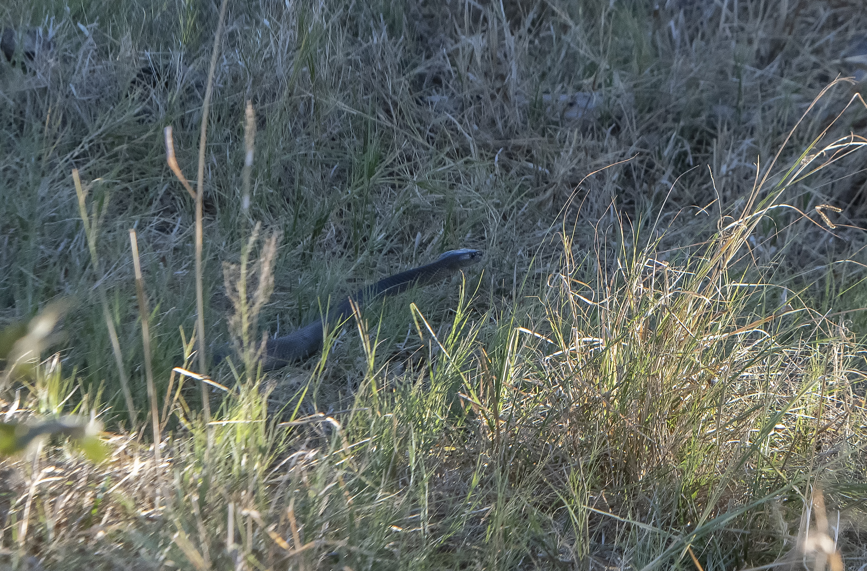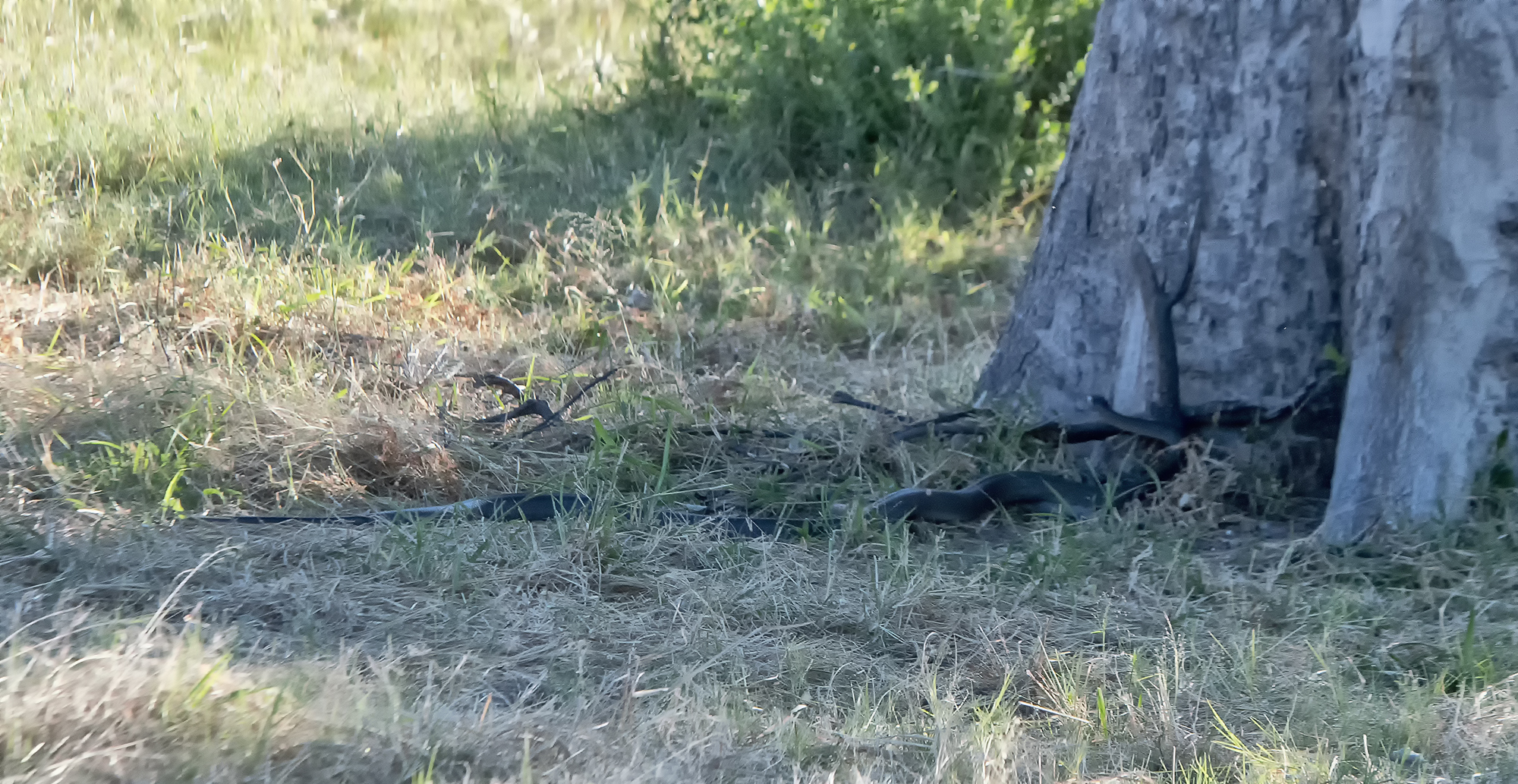 Driving along Tom and AT spotted a large bush containing dozens of screeching starlings. Tom said it might be a snake. Sure enough we spotted a seldom seen – and highly toxic – black mamba looking for a meal. The snake poked its’ head above the branches – Tom said they can raise up half of their total length! Then it quickly slid its way towards the base of a large tree and disappeared around it. The snake was at least 6″ long and quite big around.
