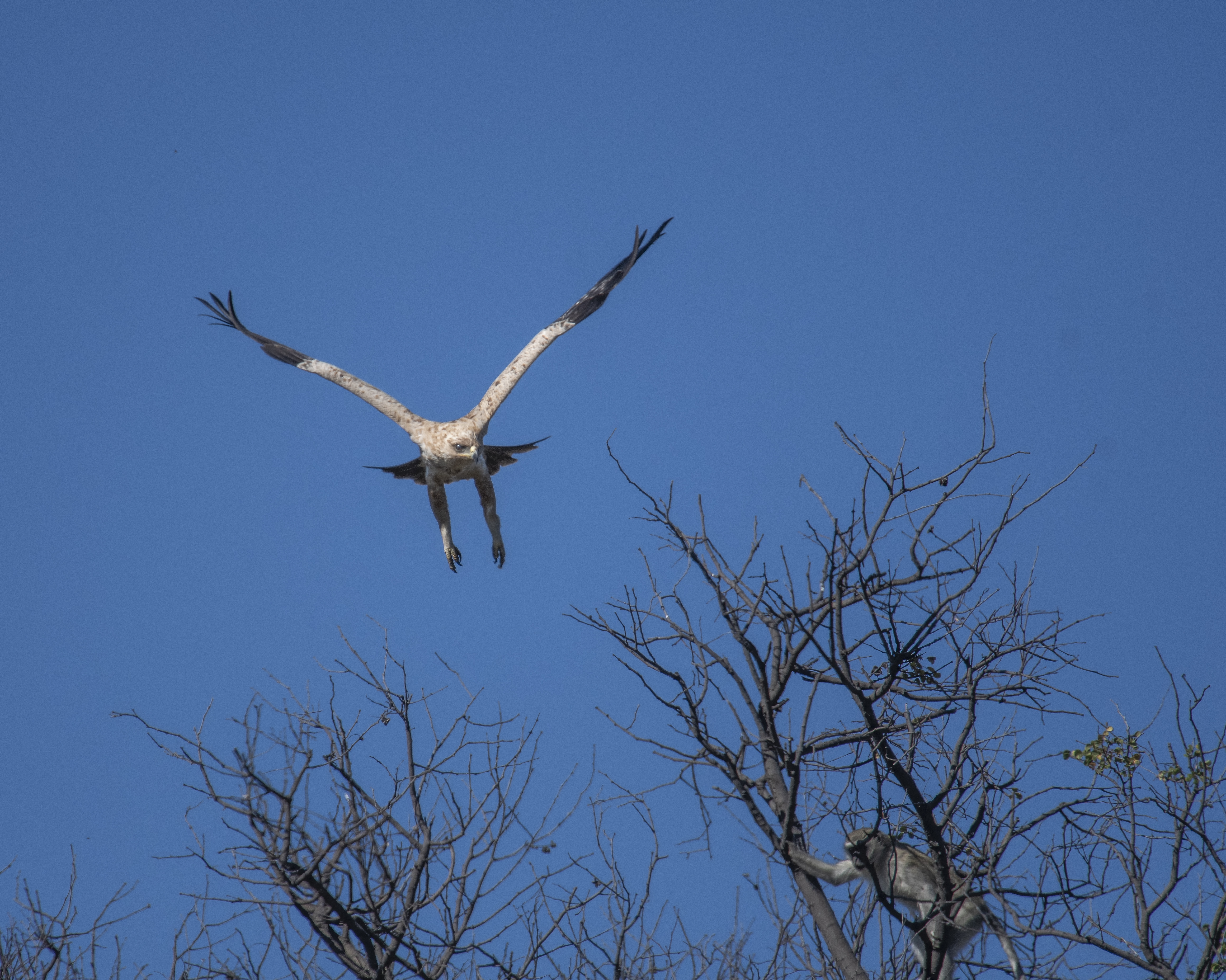 We have seen this beautiful bird in the past, usually flying in circles high above, or occasionally in a far away tree. This time was different. Tom spotted this one sitting on a branch on the other side of a smallish pond (pan) of water. It had its’ wings spread, and he guessed that the eagle had bathed and was drying out its’ wings. So we took a few images and waited for it to fly. No such luck. So Tom drove the vehicle across the pan to the other side. Now we had a great view of the eagle – but no flight. Eventually AT got off his seat and started to approach the bird – and it finally flew.