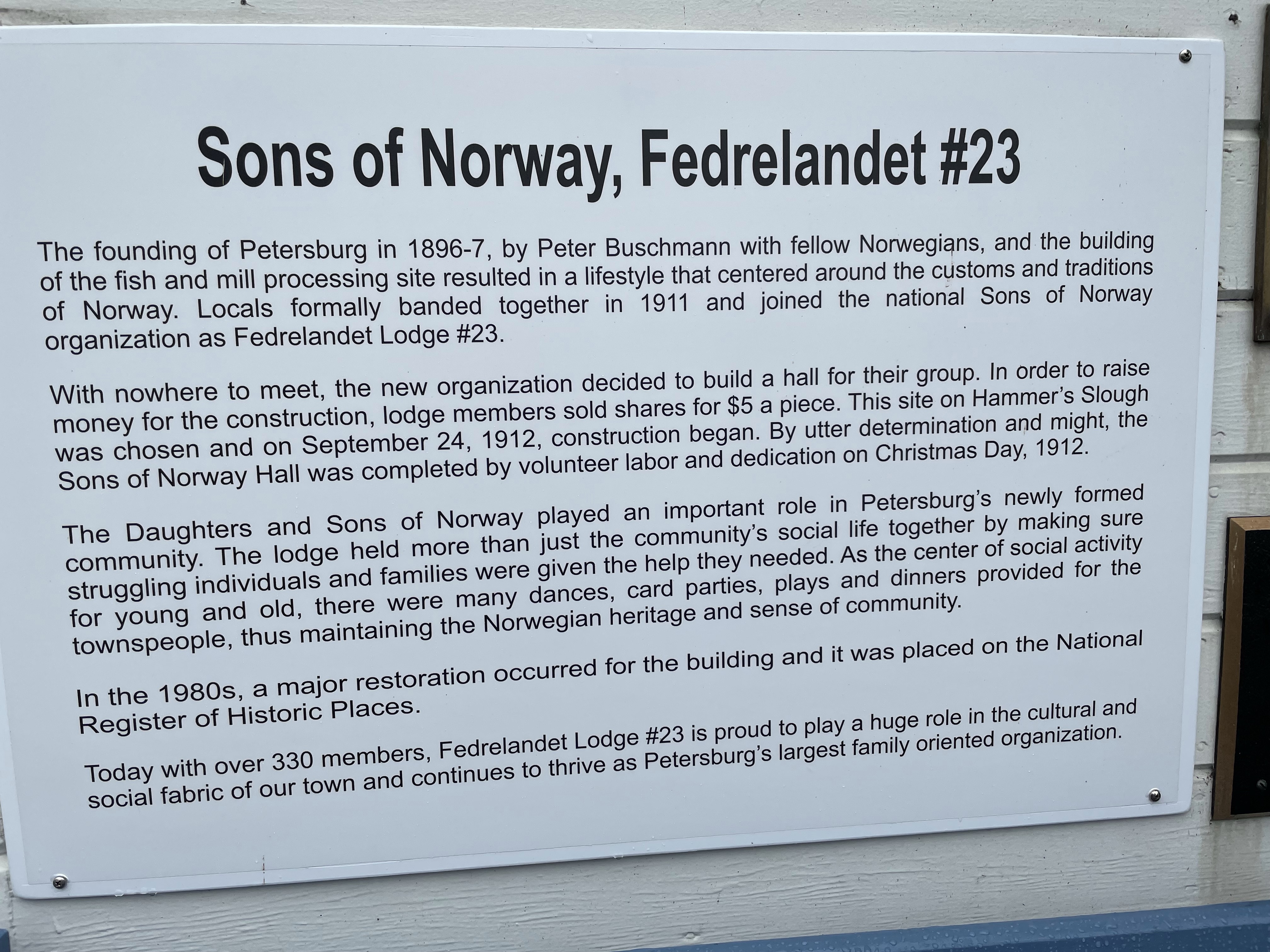 Today, Petersburg remains heavily populated by people of Scandinavian descent. Many homes qare painted bright colors. The Sons of Norway Hall has become an icon of the community.