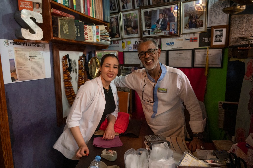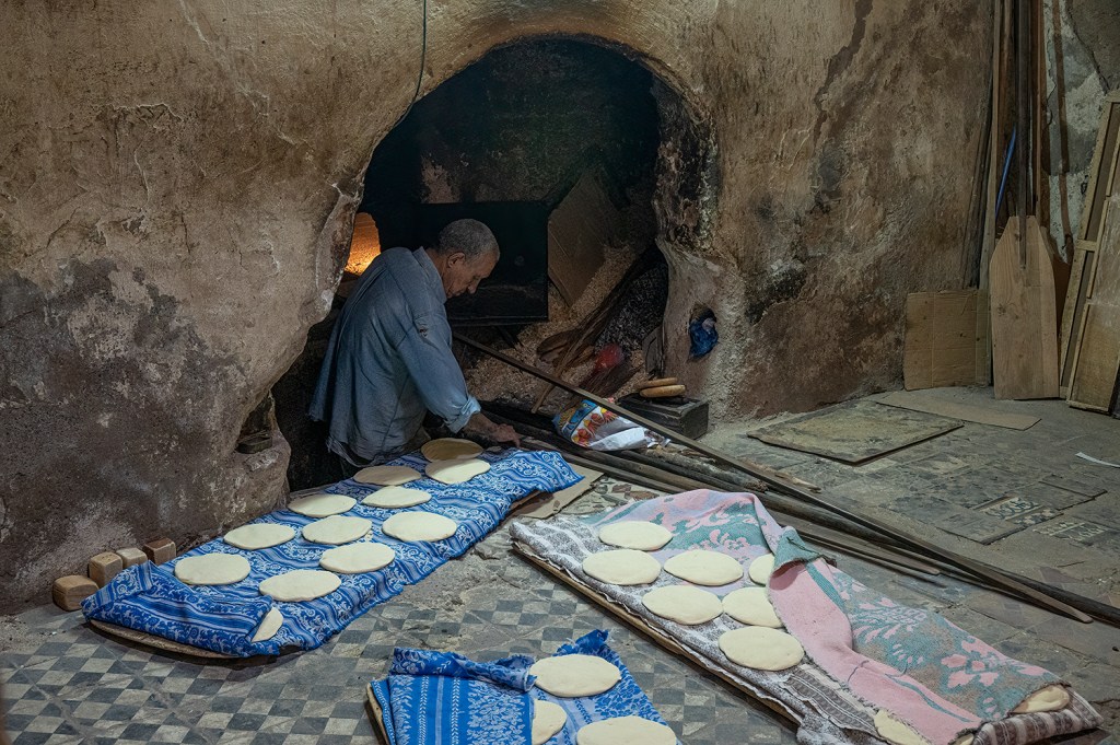After lunch, we diverted from museum-like visits to wandering and shopping in the souks. There are literally miles of narrow, winding “streets” (no cars, only people, donkeys and motorbikes) with shops, cafes, bakeries, hammams, spice stands, etc. to ogle at. The bakery was quite interesting. Each neighborhood typically has a local bakery which bakes bread supplied by the residents.