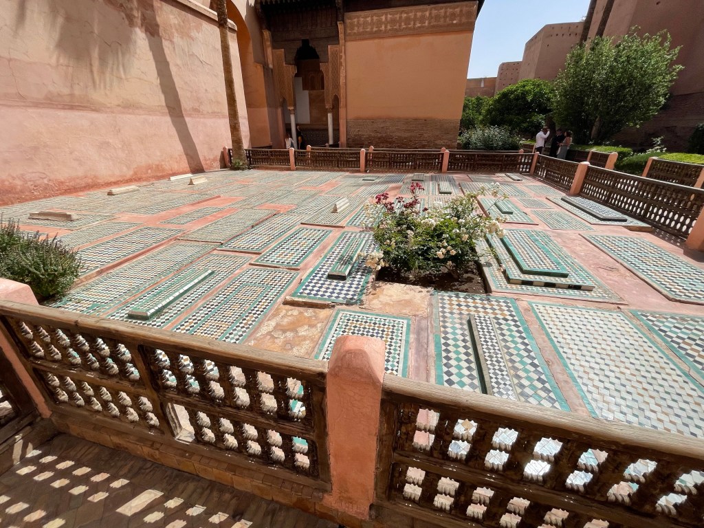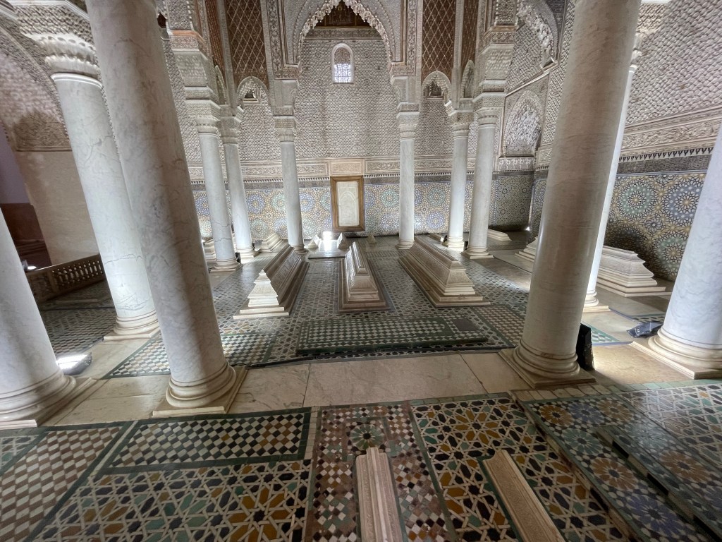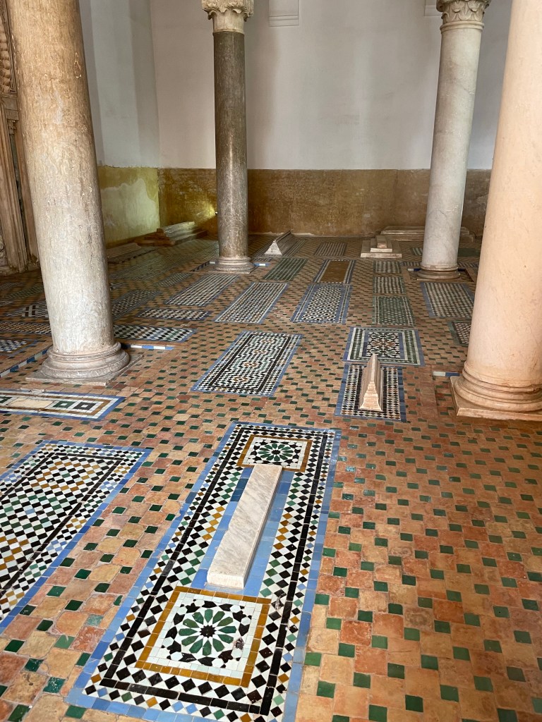 Our first stop was a visit to the Saadian tombs. This cemetery features more than 160 tombs filled with the remains of prominent Saadians, who were members of an Arab dynasty and descendants of the prophet Muhammed. The tombs date back to the 14th century and the decor from the 16th century includes cedar ceilings, colorful mosaics and Carrera marble headstones.