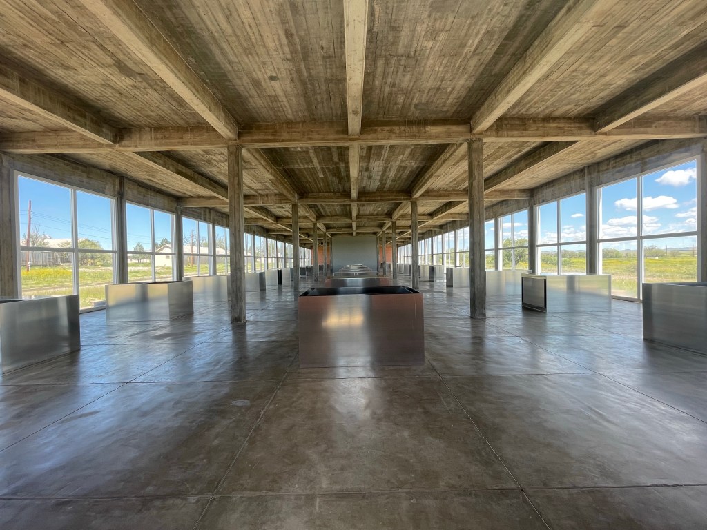 The first of Judd’s two major “pieces” included 100 untitled works in mill aluminum in two ex-artillery sheds, each 41″ x 51″ x &2″ – all different and laid out with fascinating precision.