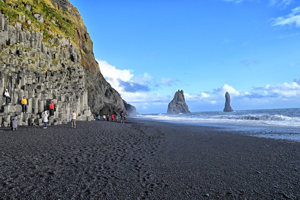 The black sand beach at Reynisfjara is backed by an incredible stack of basalt columns that look like a magical church organ. Immediately offshore are the towering sea stacks; tradition says they are the masts of ships that trolls were stealing when they got caught in the sun.