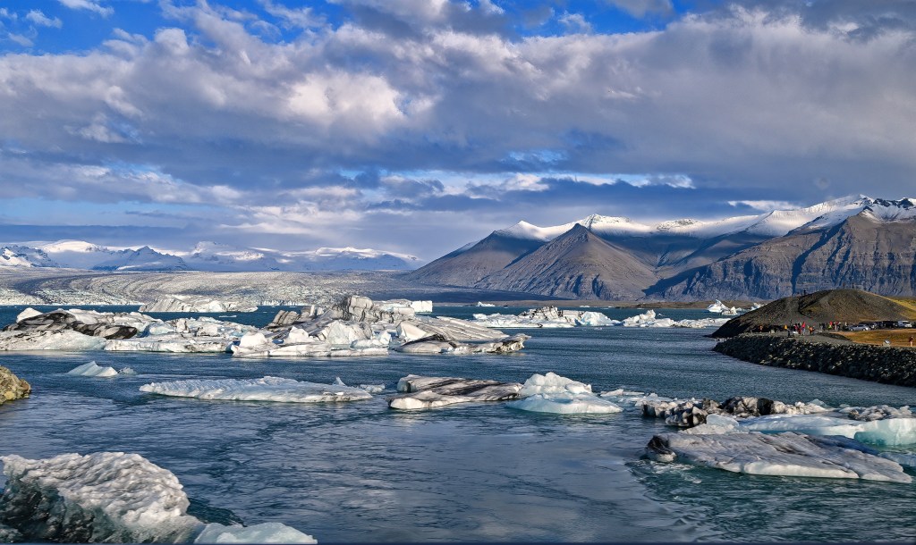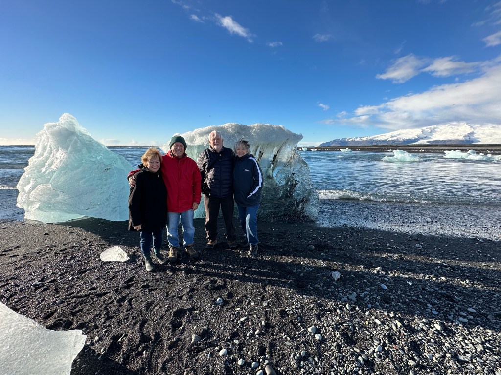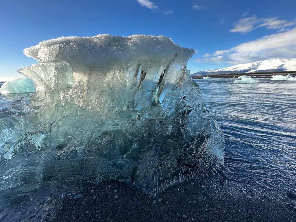 The icebergs are often blown back to the black sand beach by wind and tides, and form a spectacular vision of “diamonds” on the black sand.