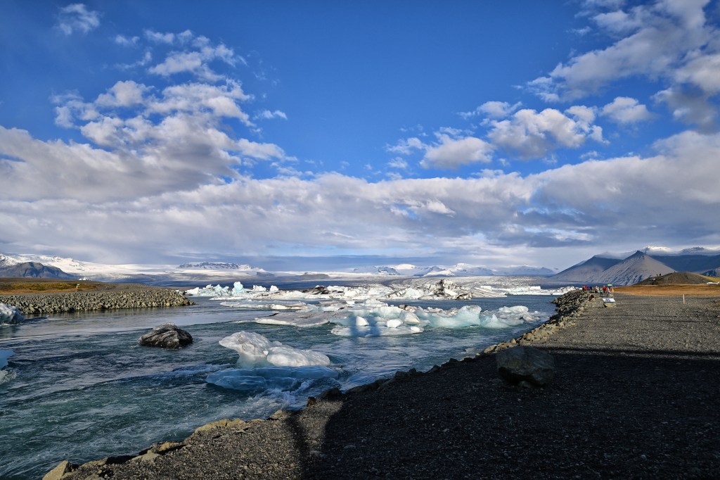 The next sight was the glacier lagoon at Jokulsarlon, filled with large chunks of ice that had broken off the glacier. These floated around the lagoon, and eventually some floated into a short river, the Jokulsa, into the sea.