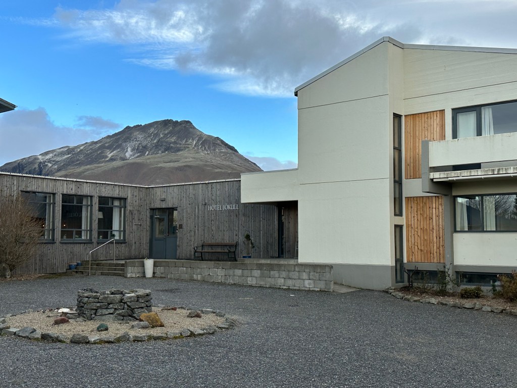 We stayed overnight at the Magma Hotel close to Kirkjubaejarklaustur, and dined at their Bistro1783, named after the year that the volcano Lakagigar erupted. The rooms were little separate huts with grass covered roofs, each dated by a volcanic eruption; ours overlooked a small lake.