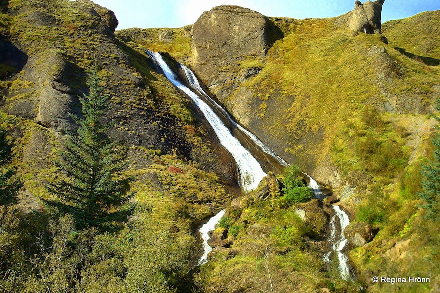 This is Foss a Siou, a lovely waterfall draining from Lake Porutjorn. The rock formations are fairy talish in nature. This is located near Kirkjubaejark.