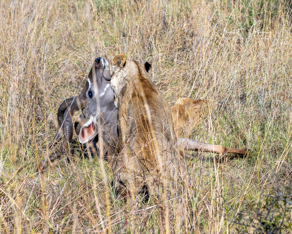 And then they sighted a large male kudu in the distance. The kudu saw or sensed the lions, turner at a right angle and ambled away.