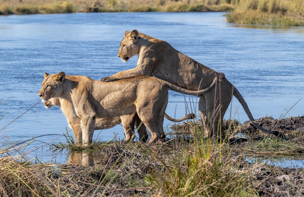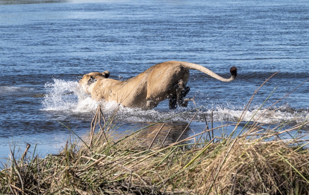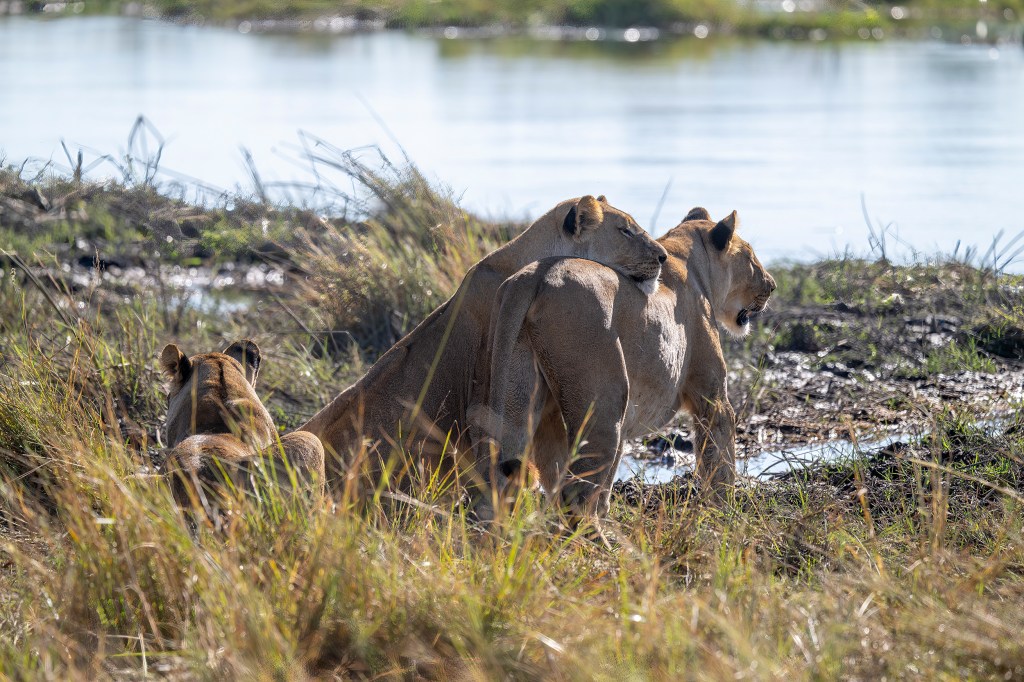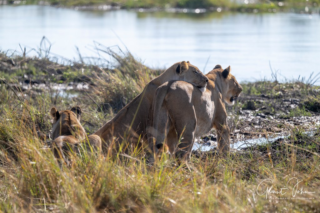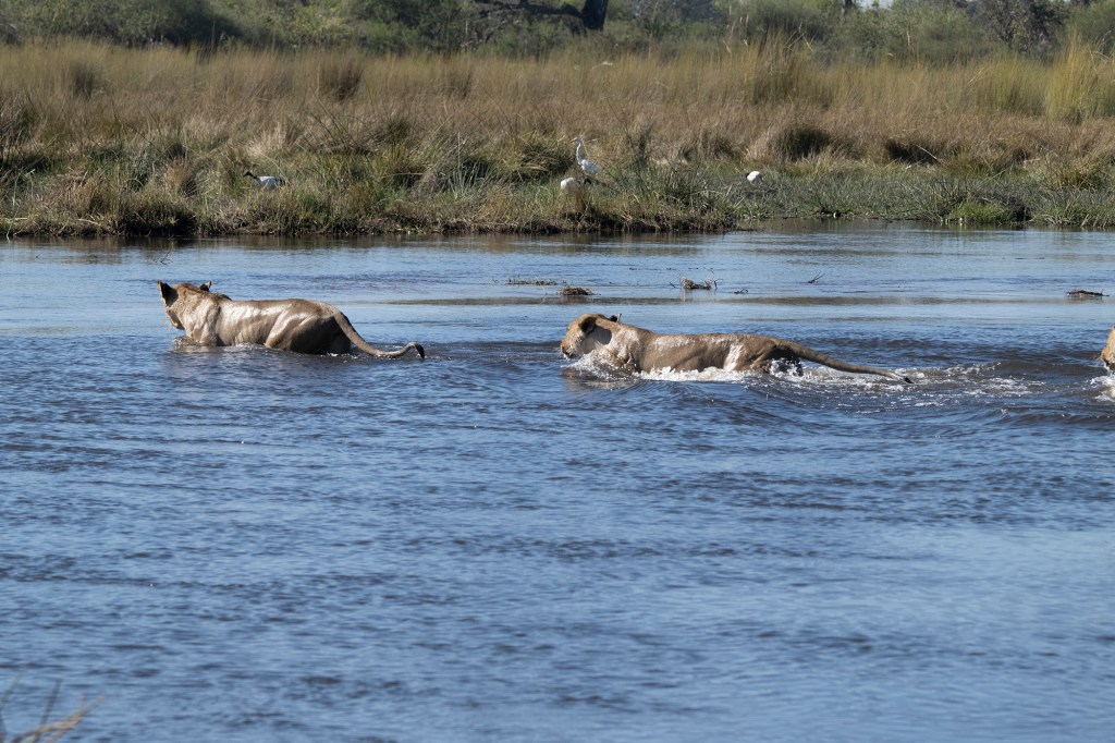 On another day at Lagoon Camp, we encountered four female lions. All were in the nursing stage. We followed them for some distance until they encountered a fairly wide stream/river. It was obvious they were going to cross; it was clear that their cubs were somewhere over there! Watching their hesitation to get wet was fascinating – they were watchful for crocs! Eventually one went and sat on the other side. It we 30-40 minutes before the other three took the plunge.