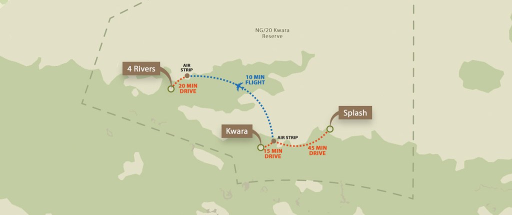 So let me show you where we went this year – and will again next June. Our first camp was Four Rivers in the Kwando Reserve adjacent to the north side of Moremi NP. This is a private reserve, allowing off road and night time driving. We love this reserve and have stayed in one of these three camps every year.