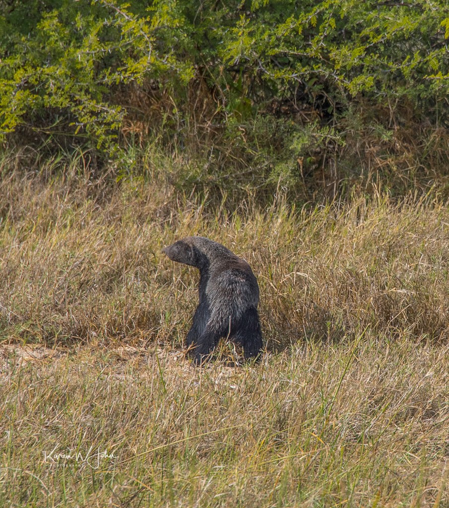 The honey badger is black with a puppyish face and grey-white back. Loves to feed on broken up bee hives. Most widespread African carnivore, most powerful and aggressive for its size. Thinly distributed and infrequently seen.