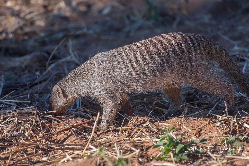 Most frequently the banded version. Most commonly observed of a group of small carnivores. Occur in playful family groups, or troops, throughout Botswana. Feeds on insects, scorpions, amphibians, reptiles and eggs.