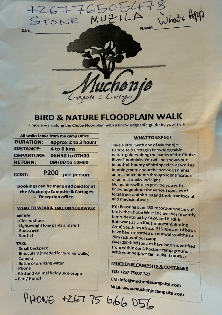 While we were staying at Muchenje Safari Lodge, we had an opportunity to go on a two hour bird walk with a bird expert, Stone Muzila. He does regular walks in the treed area at Muchenje Campsite and Cottages in the town of Muchenje. Stone is very knowledgable and a delight to be with. This property is located along the Chobe River. We saw quite a few birds, along with an unusual sighting.