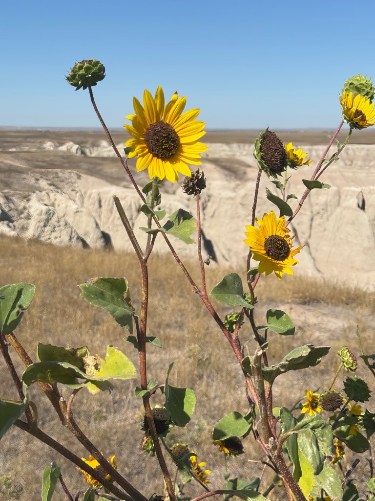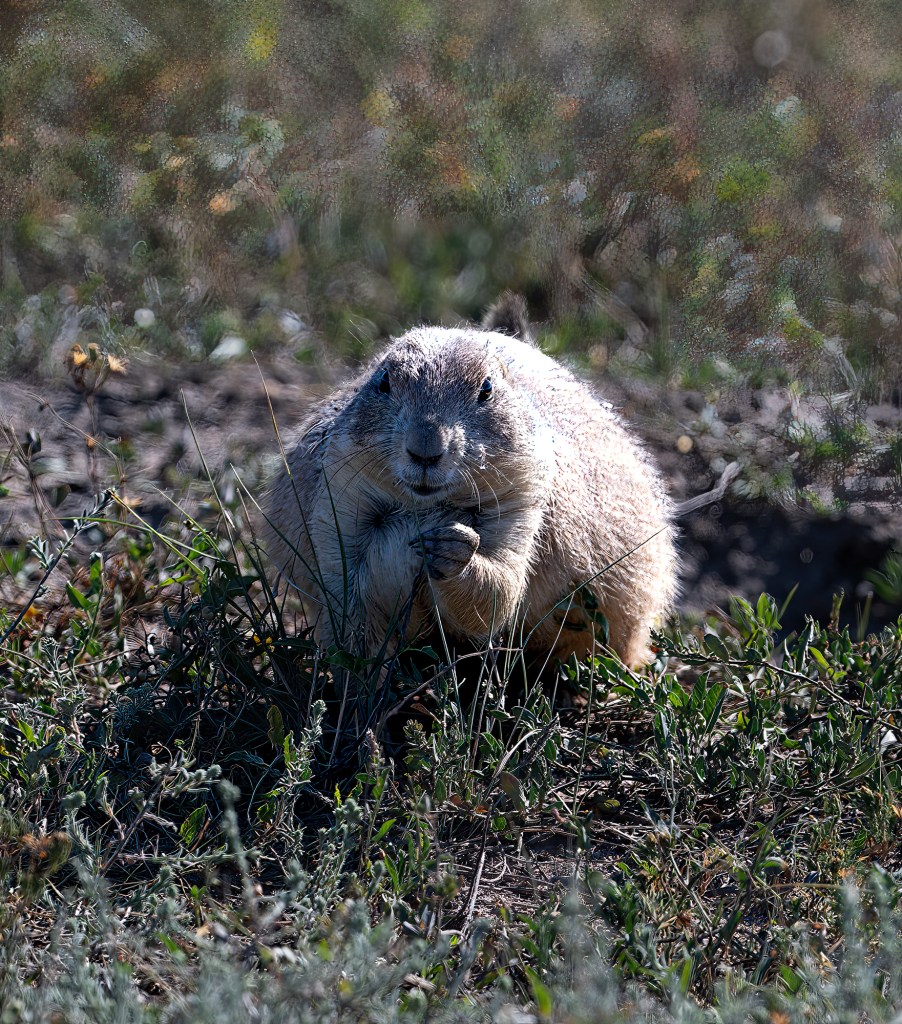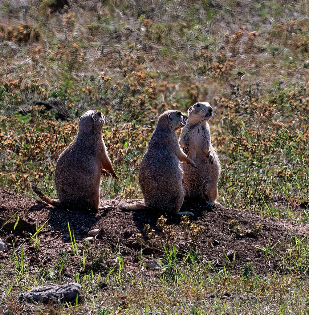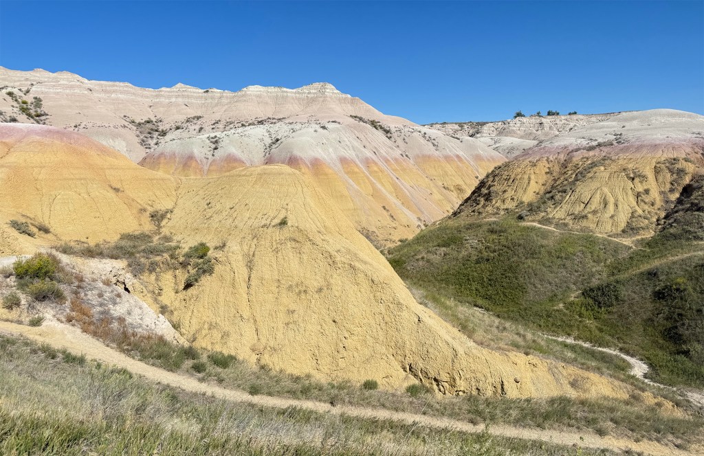We approached the east entrance to the park by driving Route 44 from the city, and got great long views of the hills, and the resident herd of bison. We started our tour at the Ben Reifels Visitor Center, which contains a ranger station, a movie theater, a museum and a gift shop. The we drove along the Loop (SD 240) Road, which wanders along the base of the hills, the up and down through the outcroppings. The geology is quite fascinating, and the dozen or so overlooks and trailheads offer differing, unique views and a number of hiking trails. Unlike many parks, Badlands allows hiking anywhere within the park. We then drove a few miles beyond the paved area along Sage Creek Overlook road, which offers several overlooks with views of grasslands, bison and lots of prairie dogs.