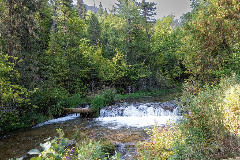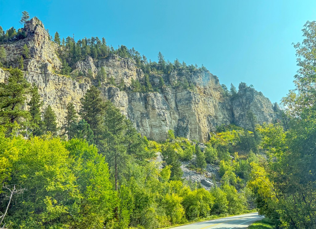 The Spearfish Canyon Scenic Byway is a 19 mile scenic drive through the Black Hills along US Route 14A. It is famous for its towering limestone cliffs, waterfalls like Bridal Veil and Roughlock Falls, and lush forest scenery. The route follows an old railroad grade, offering numerous pull-offs, hiking trails such as one to Devil’s Bathtub, and points of interest. It is a popular route for nature lovers, photographers and motorcycles, Particularly due to its proximity to Sturgis.