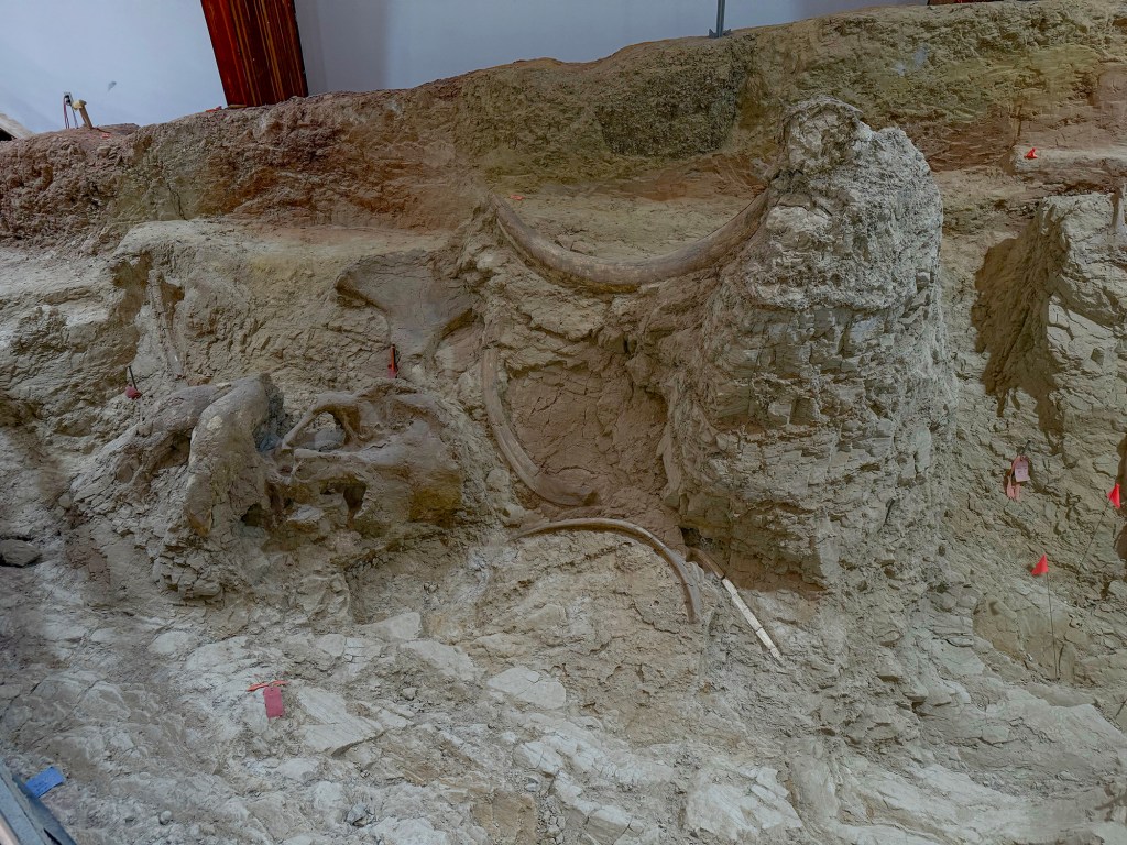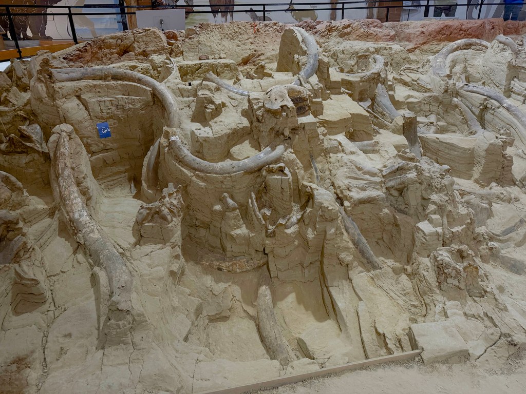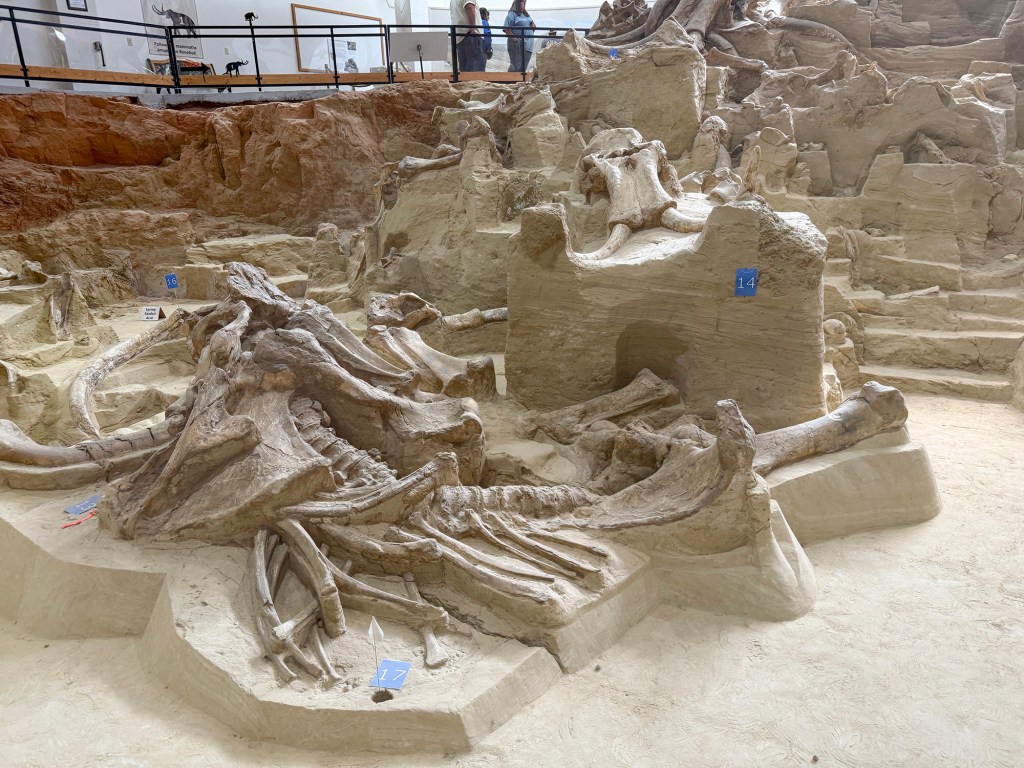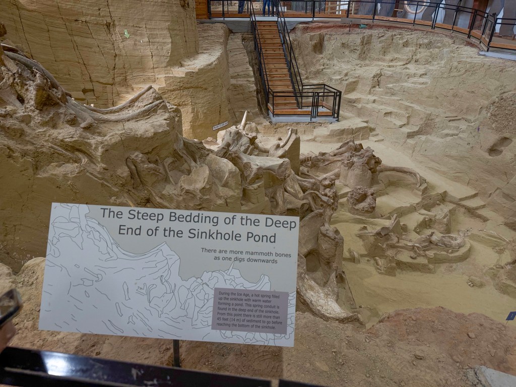 The Mammoth Site is a museum and gerontological site near Hot Springs, SD, in the Black Hills. It is an active paleontological excavation sire at which research and excavations are continuing. The facility encloses a prehistoric sinkhole that formed and was slowly filled with sediments during the Pleistocene era. The sedimentary fill of the sinkhole contains the remains of fauna and flora preserved by entrapment and burial within the sinkhole. As of 2016, the remains of 61 mammoths, including 58 North American Columbian and 3 wooly mammoths has been recovered. Mammoth bones were found at the site in 1974, and a museum and building enclosing the site were established. the museum now contains an extensive collection of mammoth remains.
