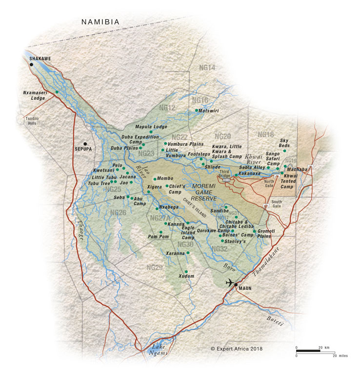 So let me show you where we went this year – and will again next June. Our first camp was Four Rivers in the Kwando Reserve adjacent to the north side of Moremi NP. This is a private reserve, allowing off road and night time driving. We love this reserve and have stayed in one of these three camps every year.